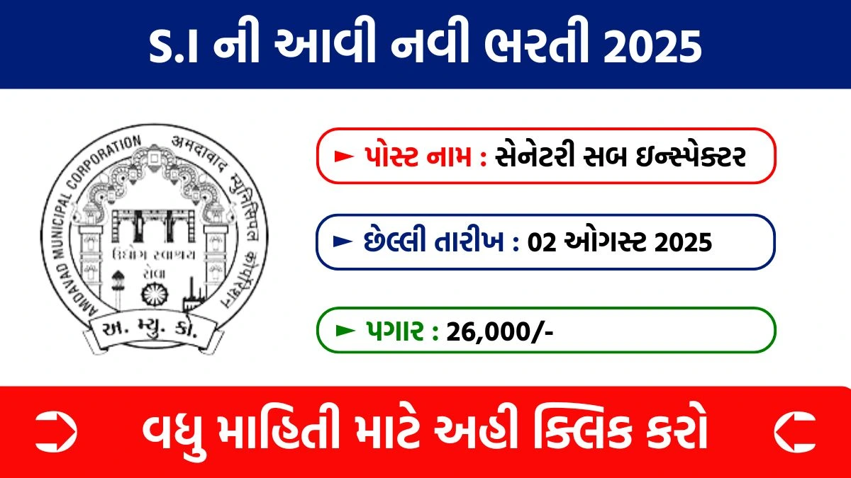 અમદાવાદ મ્યુનિસિપલ કોર્પોરેશન (AMC) દ્વારા હેલ્થ / સો.વે.મે. ખાતા હેઠળ સહાયક સેનેટરી સબ ઇન્સ્પેક્ટરની સીધી ભરતી માટે સત્તાવાર જાહેરાત (જાહેરખબર ક્રમાંક: ૦૫/ ૨૦૨૫-૨૬) બહાર પાડવામાં આવી છે. કુલ ૮૪ જગ્યાઓ માટે લાયક અને રસ ધરાવતા ઉમેદવારો પાસેથી ઓનલાઈન અરજીઓ મંગાવવામાં આવી છે.