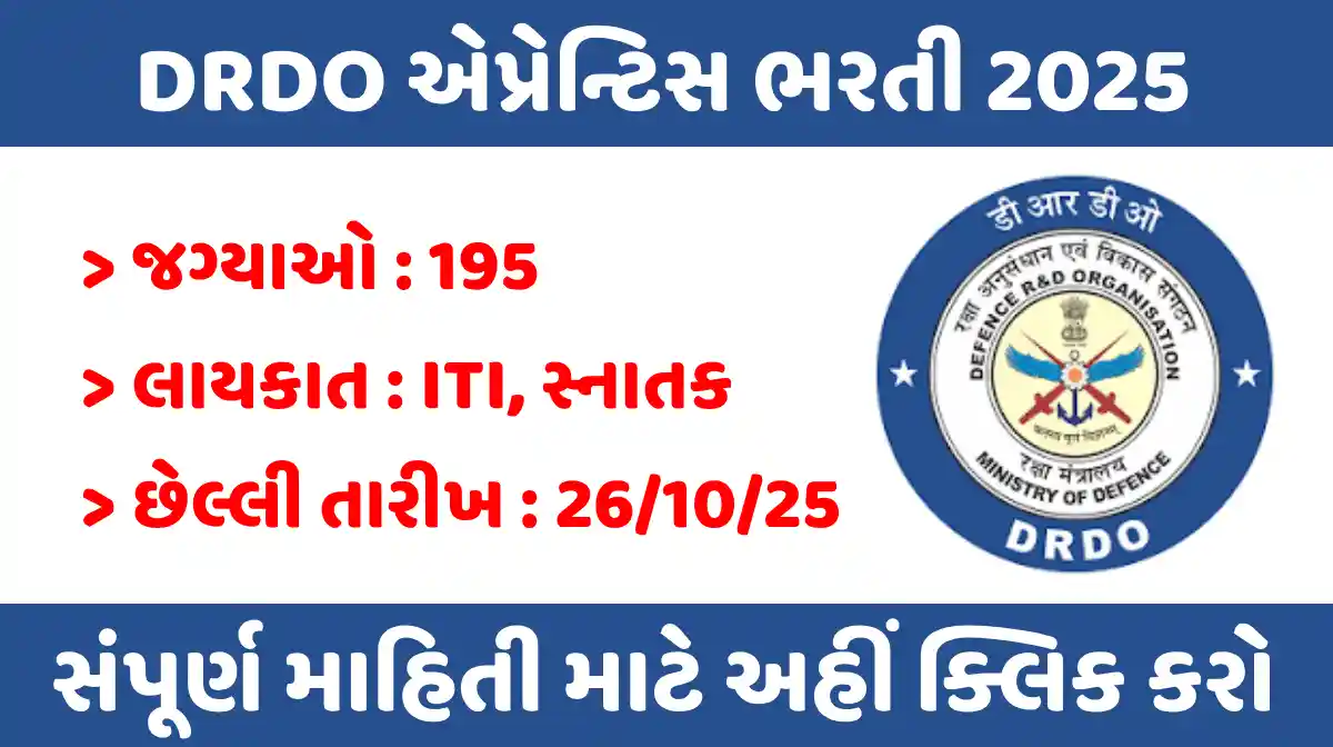 DRDO Apprentice Recruitment 2025: સંરક્ષણ સંશોધન અને વિકાસ સંગઠન (DRDO) ના રિસર્ચ સેન્ટર ઈમારત (RCI), હૈદરાબાદ દ્વારા એપ્રેન્ટિસની જગ્યાઓ માટે ઓફિસિયલ નોટિફિકેશન બહાર પાડવામાં આવ્યું છે. આ ભરતી હેઠળ ગ્રેજ્યુએટ, ડિપ્લોમા અને ITI ટ્રેડ એપ્રેન્ટિસની કુલ 195 જગ્યાઓ પર ઉમેદવારોની ભરતી કરવામાં આવશે. પસંદ થયેલ ઉમેદવારોને એપ્રેન્ટિસ એક્ટ 1961 હેઠળ એક વર્ષની તાલીમ આપવામાં આવશે.