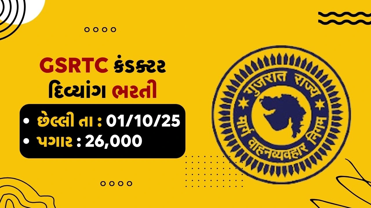 GSRTC Conductor (Divyang) Recruitment 2025 : ગુજરાત રાજ્ય માર્ગ વાહન વ્યવહાર નિગમ (GSRTC) દ્વારા દિવ્યાંગ ઉમેદવારો માટે ખાસ ભરતી ઝુંબેશ હેઠળ કંડક્ટરની પોસ્ટ માટે ભરતી જાહેર કરવામાં આવી છે. આ ભરતીમાં કુલ ૫૭૧ જગ્યાઓ પર પસંદગી યાદી અને પ્રતિક્ષાયાદી તૈયાર કરવામાં આવશે.