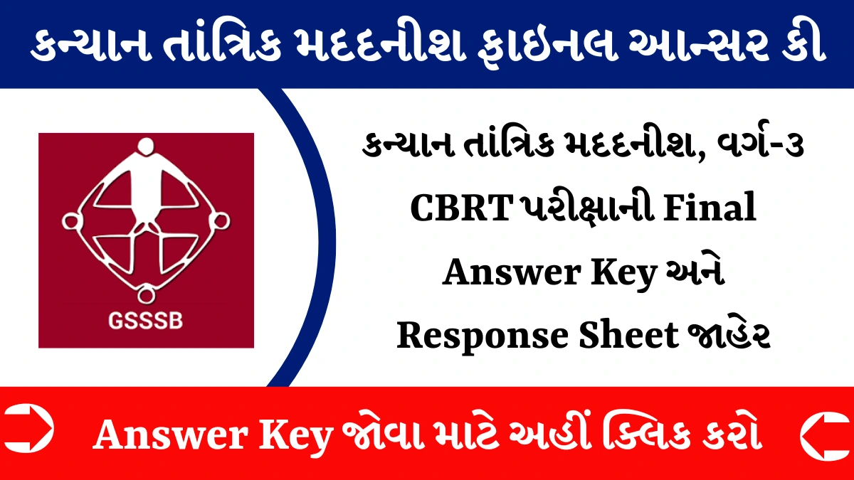 GSSSB Final Answerkey 2025 | કન્યાન તાંત્રિક મદદનીશ, વર્ગ-૩ CBRT પરીક્ષાની Final Answer Key cum Response Sheet