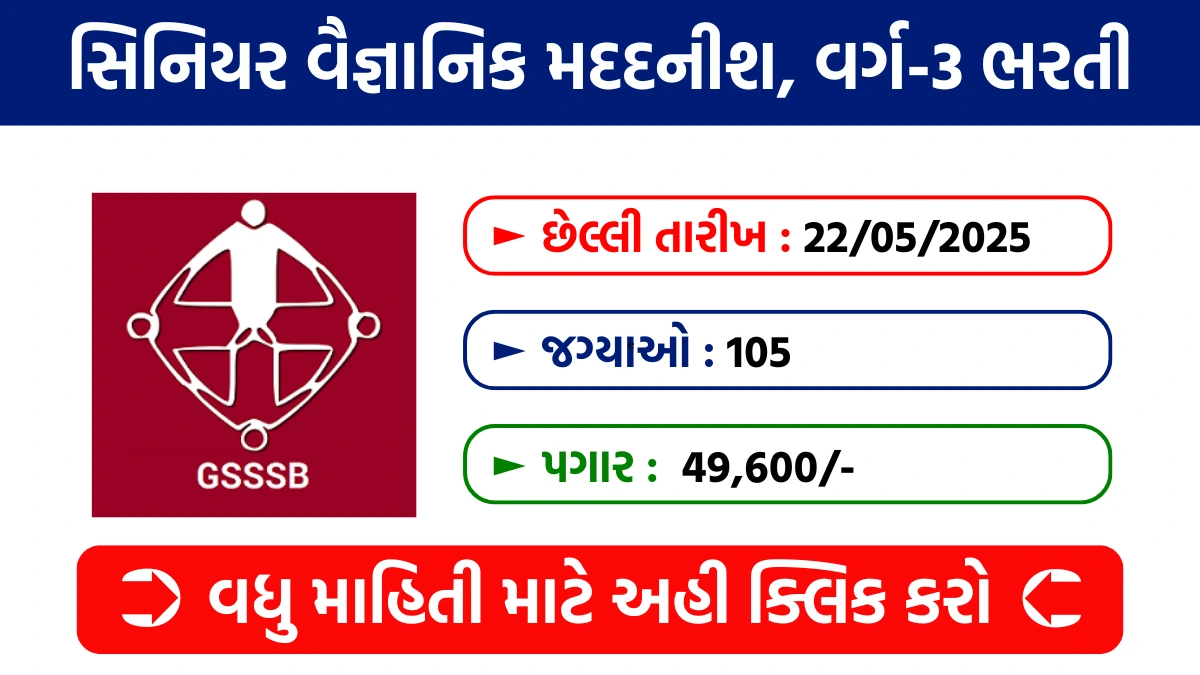 GSSSB Requirement 2025 : શું તમે સરકારી નોકરીની શોધમાં છો? તો ગુજરાત પ્રદૂષણ નિયંત્રણ બોર્ડ (GSSSB), ગાંધીનગર દ્વારા સિનિયર વૈજ્ઞાનિક મદદનીશ, વર્ગ-3 સંવર્ગની કુલ 105 જગ્યાઓ માટે ભરતીની જાહેરાત બહાર પાડવામાં આવી છે. આ ભરતી માટે ઓનલાઈન અરજી પ્રક્રિયા 7 મે 2025થી શરૂ થશે અને 22 મે 2025 સુધી ચાલશે. ઉમેદવારોને વિનંતી છે કે અરજી ફોર્મ ભરતા પહેલા ઓફિશિયલ નોટિફિકેશન ધ્યાનથી વાંચી લેવું.