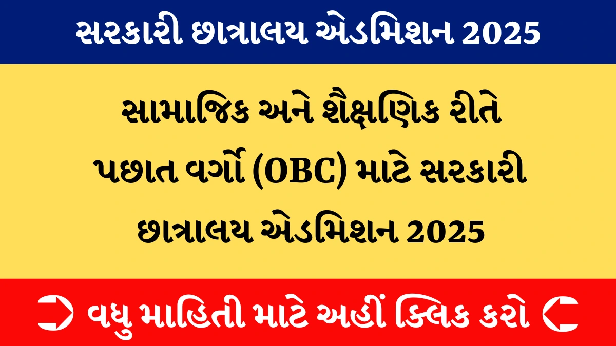 સામાજિક અને શૈક્ષણિક રીતે પછાત વર્ગો (OBC) માટે સરકારી છાત્રાલય એડમિશન 2025: ગુજરાત સરકાર દ્વારા સામાજિક અને શૈક્ષણિક રીતે પછાત વર્ગો (OBC) તથા આર્થિક રીતે પછાત વર્ગો (બક્ષીપંચ) ના વિદ્યાર્થીઓ માટે સરકારી છાત્રાલયોમાં એડમિશન માટે ઓનલાઇન ફોર્મ શરૂ કરવામાં આવ્યા છે. આ યોજના હેઠળ મફત જમવાની અને રહેવાની સગવડ આપવામાં આવશે. ઓનલાઇન અરજી પ્રક્રિયા 26 મે 2025 થી શરૂ થશે અને 30 જૂન 2025 ના રોજ 23:59 કલાક સુધી ચાલશે. ઉમેદવારોએ https://esamajkalyan.gujarat.gov.in વેબસાઇટ પરથી અરજી કરવાની રહેશે.