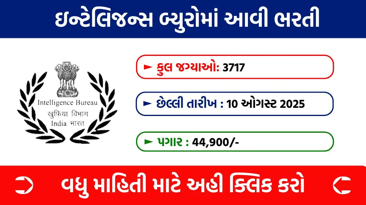 ગુપ્તચર વિભાગ (Intelligence Bureau – IB) દ્વારા એક્ઝિક્યુટિવ સંવર્ગમાં મોટી ભરતીની જાહેરાત કરવામાં આવી છે! કુલ 3717 ખાલી જગ્યાઓ માટે લાયક ઉમેદવારો પાસેથી અરજીઓ મંગાવવામાં આવી રહી છે. કેન્દ્ર સરકારમાં સુરક્ષા સંબંધિત ક્ષેત્રમાં કારકિર્દી બનાવવા માંગતા યુવાનો માટે આ એક ઉત્તમ તક છે.