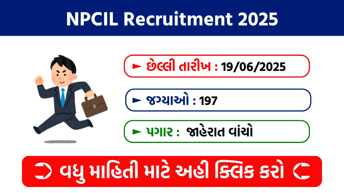 NPCIL Recruitment 2025: ન્યુક્લિયર પાવર કોર્પોરેશન ઓફ ઈન્ડિયા (NPCIL) દ્વારા વિવિધ પોસ્ટ્સ માટે ભરતીની જાહેરાત બહાર પાડવામાં આવી છે. આ ભરતીમાં ટ્રેઇની/સાયંટિફિક આસિસ્ટન્ટ, ટેક્નિશિયન, અને આસિસ્ટન્ટની કુલ 197 જગ્યાઓ માટે ઓફલાઇન અરજીઓ આમંત્રિત કરવામાં આવી છે. ઓફલાઇન અરજી પ્રક્રિયા 28 મે 2025 થી શરૂ થશે અને 19 જૂન 2025 ના રોજ સમાપ્ત થશે. ઉમેદવારોએ https://www.npcil.nic.in વેબસાઇટ પરથી ફોર્મ ડાઉનલોડ કરીને અરજી કરવાની રહેશે.
