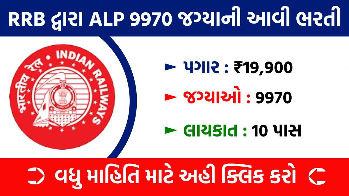 RRB ALP Recruitment 2025 : રેલ્વે ભરતી બોર્ડ (RRB) દ્વારા અસિસ્ટન્ટ લોકો પાયલટ (ALP) ની 9970 જગ્યાઓ માટે ભરતીની ઓફિશિયલ નોટિફિકેશન બહાર પાડવામાં આવી છે. આ ભરતી ઓનલાઇન ઇન્ડેન્ટિંગ એન્ડ રિક્રૂટમેન્ટ મેનેજમેન્ટ સિસ્ટમ (OIRMS) દ્વારા કરવામાં આવશે. આ ભરતીમાં ઝોનલ રેલ્વે મુજબ જગ્યાઓનું વિભાજન કરવામાં આવ્યું છે, જેમાં કુલ 9970 જગ્યાઓ મંજૂર કરવામાં આવી છે.