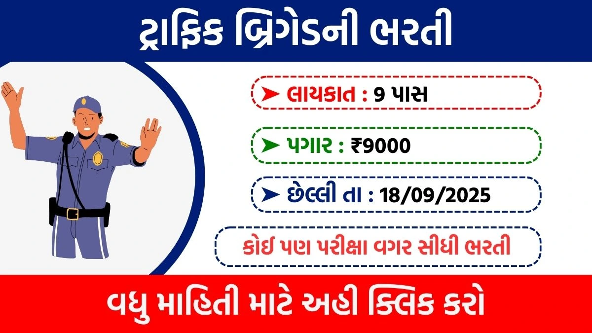 અમદાવાદ ટ્રાફિક પોલીસ તથા અમદાવાદ ટ્રાફિક બ્રિગેડ ટ્રસ્ટ દ્વારા તાજેતરમાં ટ્રાફિક બ્રિગેડમાં માનદ સેવકોની ભરતી માટે જાહેરાત બહાર પાડવામાં આવી છે. આ ભરતી ખાસ કરીને ટ્રાફિક નિયમન અને વ્યવસ્થામાં સહાયરૂપ થવા ઈચ્છતા ઉમેદવારો માટે એક ઉત્તમ તક છે. આ જાહેરાત અનુસાર, ધોરણ ૮ પાસ ઉમેદવારો પણ આ માનદ સેવા માટે અરજી કરી શકે છે, જેથી ઓછામાં ઓછી શૈક્ષણિક લાયકાત ધરાવતા યુવાનો પણ દેશ અને સમાજસેવામાં પોતાનું યોગદાન આપી શકે.